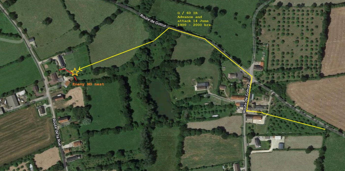 During this time, an act of bravery helped to get the men of the 60th Infantry moving. Staff Sergeant Paul Edwin Alexander and his fellow G Company men arrived in the area of Renouf from the east. Passing through an apple orchard they moved through a couple of farm buildings in the hamlet of Gottot and turned right onto the road, leading towards a small cross road junction. Here they turned left on the Route des Buts Dores and carefully advanced alongside the road and hedgerows. They then took a sunken, covered trail which led to a field near another farm house, located not too far from the main area of Renouf.