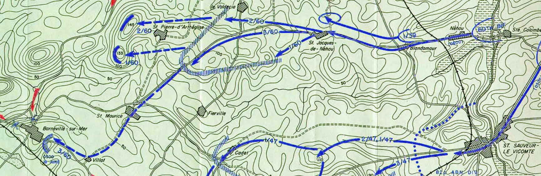 When the leading 3rd Battalion was temporarily stopped at the crossroads at Blandamour, the 2nd Battalion immediately slipped around the right flank of the 3rd Battalion, echeloned to the right and continued the advance to La Valdecie. St. Pierre d’Artheglise and Hill 145.
