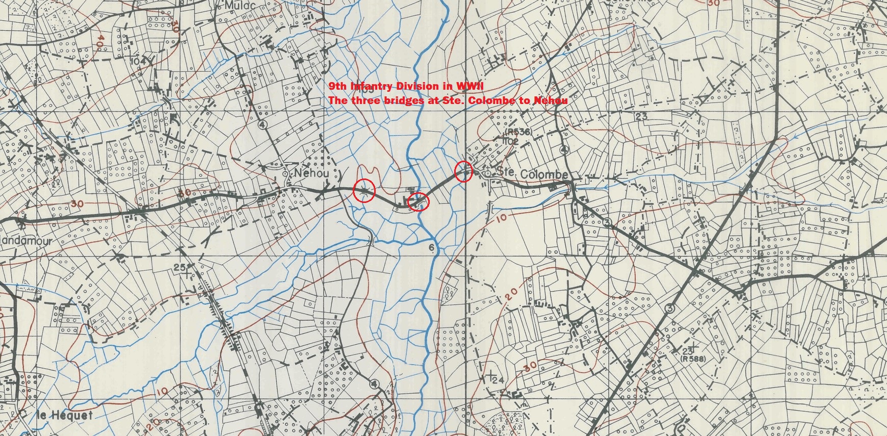 A pre-invasion map reconnaissance had been made in anticipation of the crossing of the Douve at this point. Intelligence had indicated that there were mine fields on the west bank, south of Néhou, and the 9th Infantry Division had considered fording the river farther north. However, in the fast-moving situation of June 16th it had been decided to make a dash to Ste. Colombe and cross as quickly as possible.