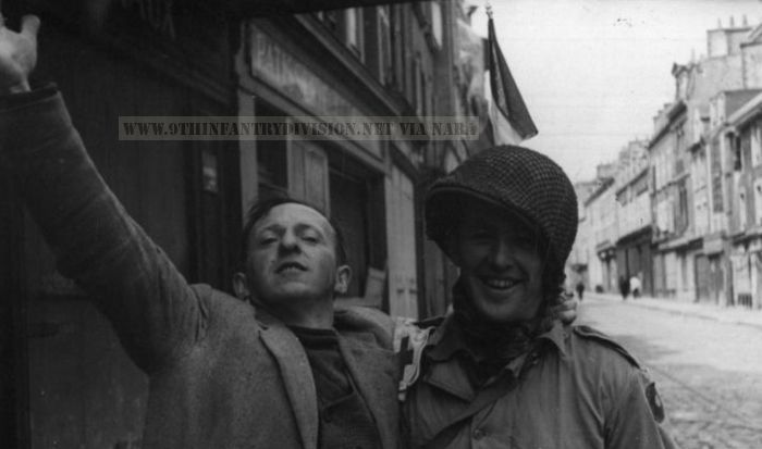 Vive la France! Frenchman and 9th Infantry Division soldier in France, 1944.