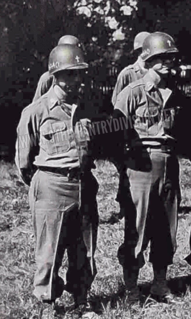 Chaplains of the 39th Infantry Regiment stand at attention, listening to a “Call to Memorial” speech in the town of Aichnach, Germany in 1945. Interesting to see their helmets with the AAA-O slogan and the holy cross.