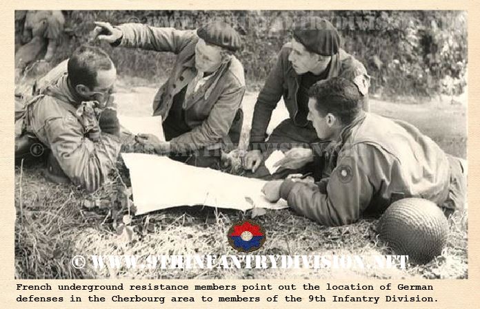 French underground resistance members inform 9th Infantry Division men about German locations near Cherbourg, 1944.