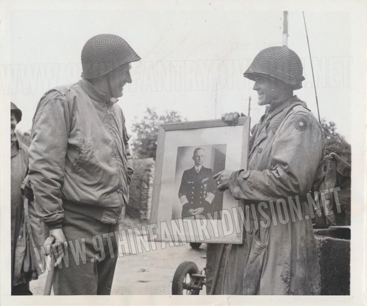 Major Frank Gunn of 1st Battalion, 39th Infantry Regiment, shows a picture of a German officer believed to have been the head of the Cherbourg Region to Major General Manton S. Eddy. Both men are smiling at the picture, which was found in the captured German headquarters in Cherbourg. Picture taken on July 1st, 1944.