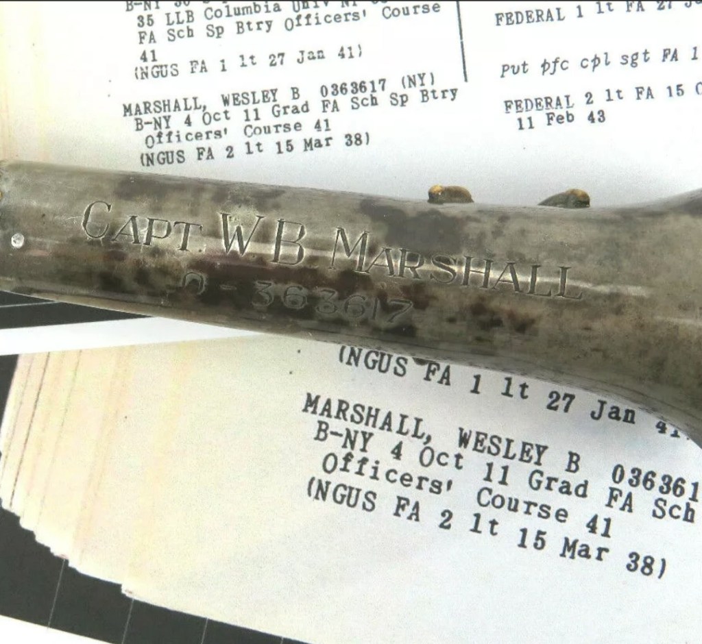 This is something you don’t come across that often. Here we have an original World War Two Officer’s Walking or Swagger Stick. This theater made stick belonged to Captain Wesley Bryde Marshall who served in the 26th Field Artillery Battalion of the 9th Infantry Division. It is engraved with his name and full service number. Engraving appears as: