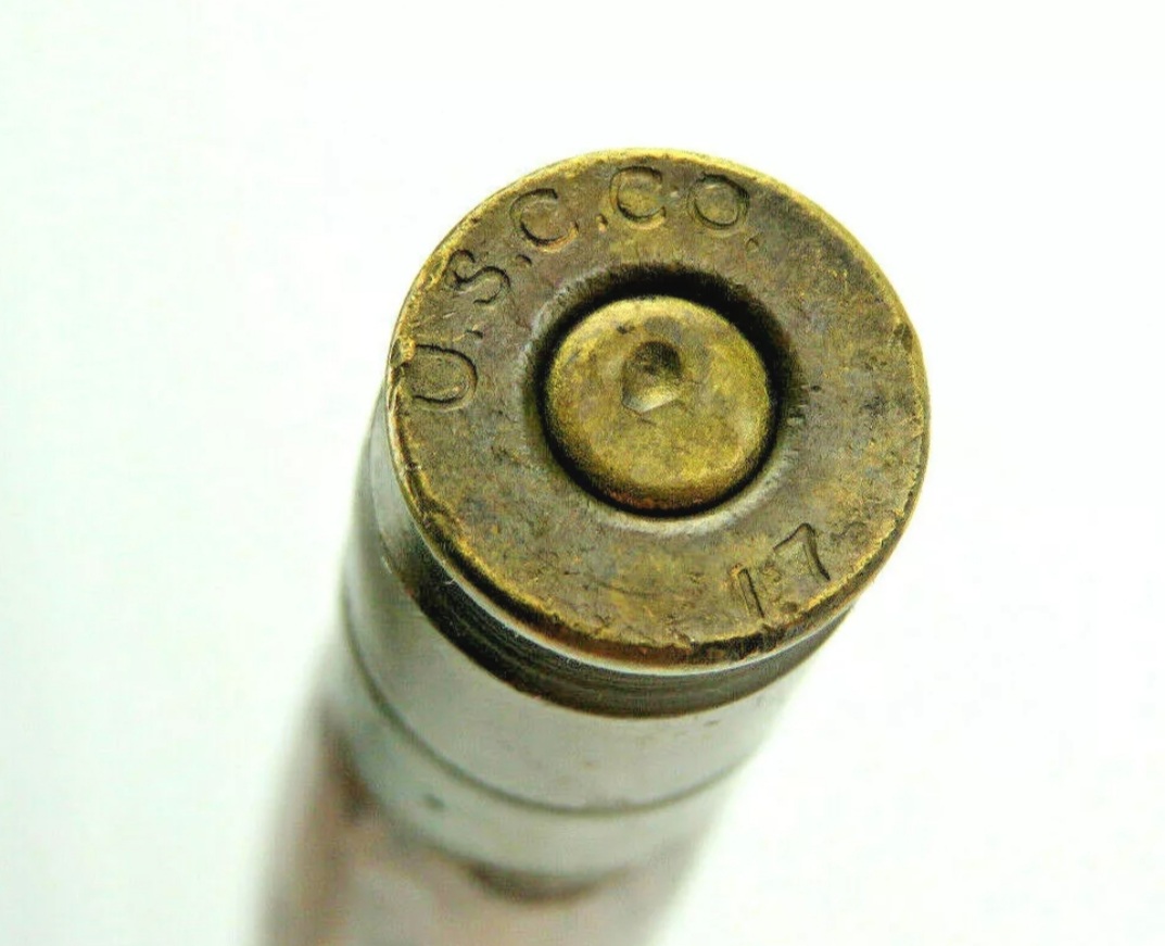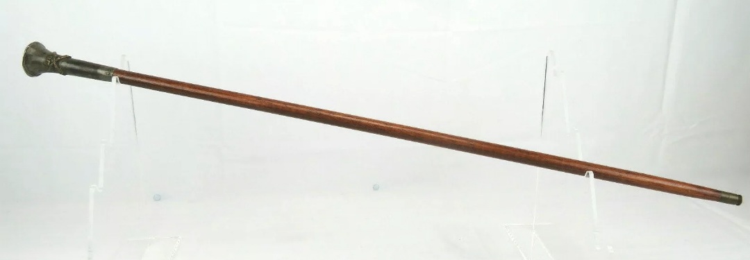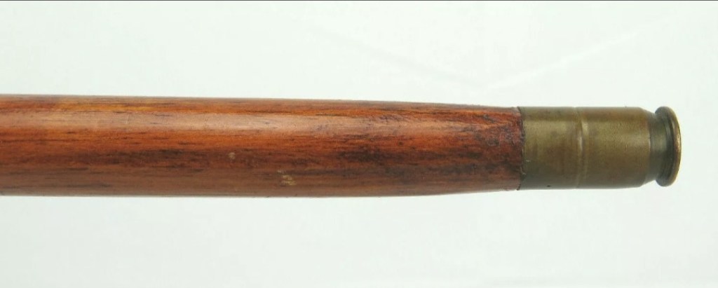 The stick is about 31 1/2 inches in length and is made of stained hardwood with gloss finish. It has a large silver plated top. A great detail is the tip, constructed from a 1917 dated .45 pistol shell.