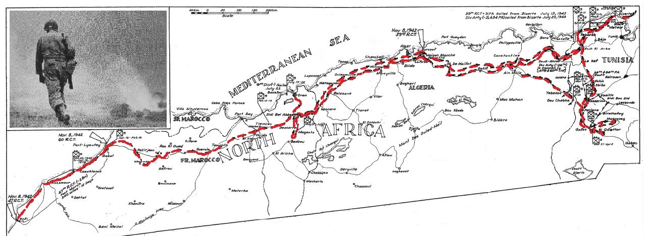 The 9th Infantry Division was introduced to the North-African theater – and vice versa – just before dawn on November 8th, 1942, when the 39th Combat Team (which had come via the British Isles) landed at Algiers. At the same time, the 47th Combat team was hitting the beach at Safi, French Morocco while the 60th Combat Team was hammering at the Kasba and the airport at Port Lyautey, Morocco. There, in the short sharp murderous battle that preceded victory, the Division received the baptism of fire which put the ultimate touches to its preparation for the big job. Following the cessation of hostilities, plans were made to regroup the Division at Port Lyautey. The 39th Combat Team remained near Algiers, and during the next three months it was strung out more than 500 miles, guarding communication lines. The 47th made a foot march of over 250 miles from Safi to Port Lyautey, while the remainder of the Division landed at Casablanca and moved to the Division area. By the first of January 1943, the 9th Division, less the 39th Combat Team, was concentrated near Port Lyautey.