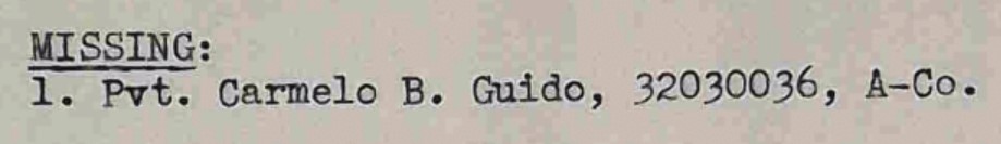 The war brought him to Europe, and in December 1944, he found himself in the Hurtgen Forest area where a battle was raging in the small town of Merode. As part of the 39th Infantry Regiment, Carmelo helped to capture the Merode castle and securing the town. However, on December 12th, 1944 he lay down with some comrades to sleep in a house in Merode. During the night, a mortar shell hit the house and set it on fire. All the soldiers, except Carmelo B. Guido managed to leave the house. Guide was killed in the flames. The house burned down completely. His remains were never found and is still considered a missing person case.