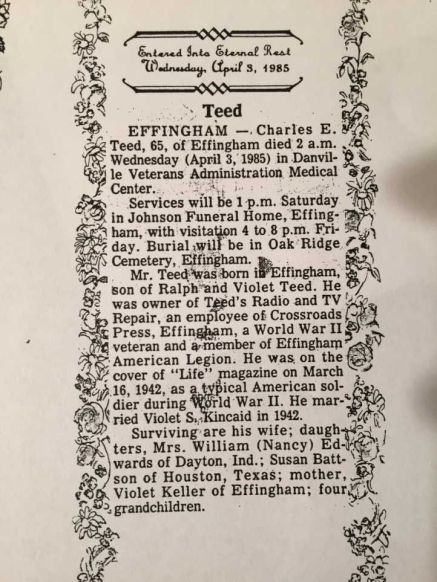 Sgt. Charles E. Teed received 2 Purple Hearts, 5 Battle Stars and rose to the rank of Sergeant. After he was discharged from the Army, Charles came back to Effingham where he and Violet raised their family. He eventually opened a TV repair shop at his home on Kentucky Street. He later worked at Crossroads Press. – Photos by Edward Clark – LIFE Collections