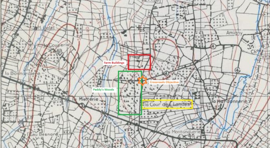 The Regimental S-3 Major Thomas A. E. Mosely was there as well, alongside Paddy’s radio / walkie talkie operator Tech Sergeant Harold M. Bruskin and his jeep driver Tec 5 Charles E Witzel. Hearing that heavy enemy concentrations of frontal and flanking fire was being zeroed in on a small orchard surrounded by hedgerows some 500 yards north of the important St. Lo / Marigny – Periers road, preventing his men from advancing, Paddy knew he had to do something. He also noticed that 2nd Battalion Commander Lt. Col. Frank Gunn was not present at the Command Post. Before heading off to find Lt. Col. Gunn, Paddy observed the surroundings to get a good tactical understanding of the situation.