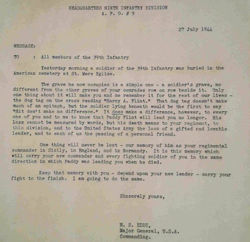 On July 27th, the day after the funeral, Major General Manton S. Eddy issued a letter to the men of the 39th Infantry Regiment that read: