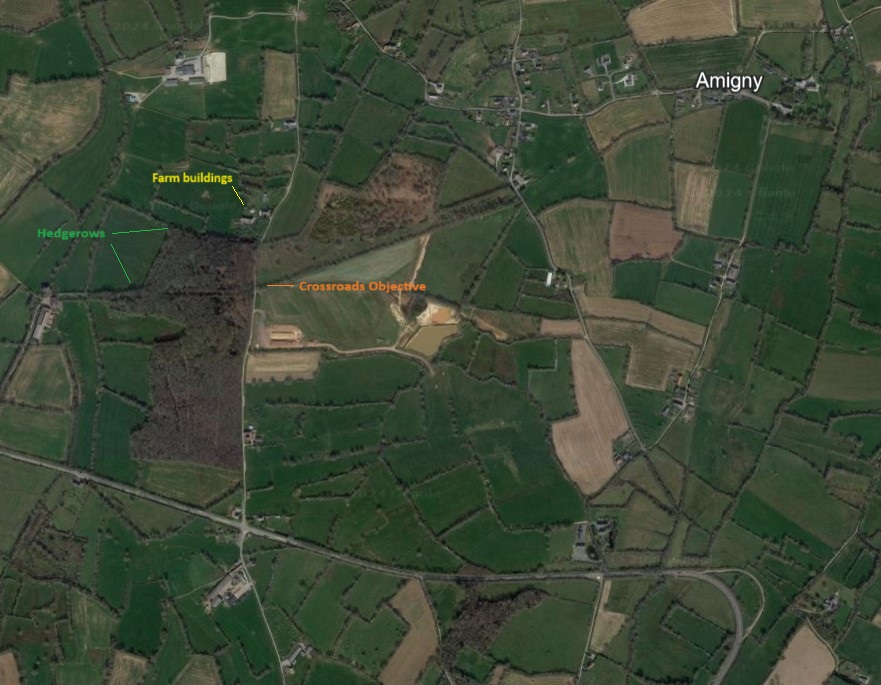 Finally Paddy jumped down from the tank to get into a more covered position. He shouted more instructions to the tank driver, ordering him to move the tank another 50 yards down the road. This would give Paddy and his men enough time to make a flanking movement around the buildings. They arrived at the farm buildings and another radio message was sent back to HQ.
