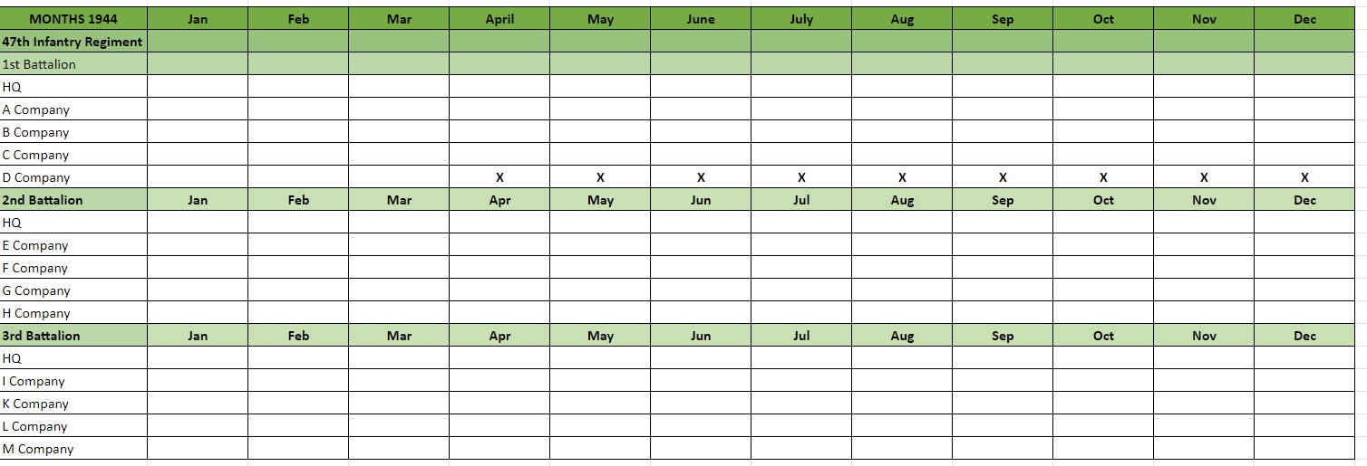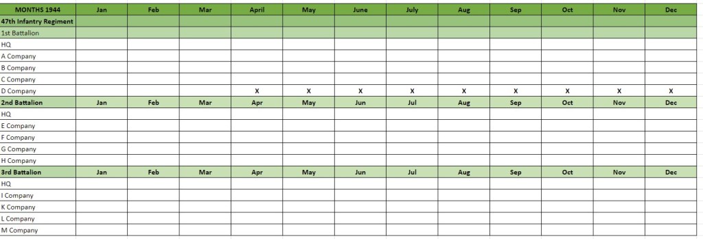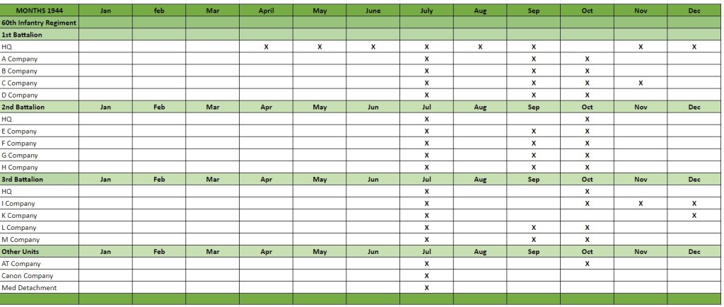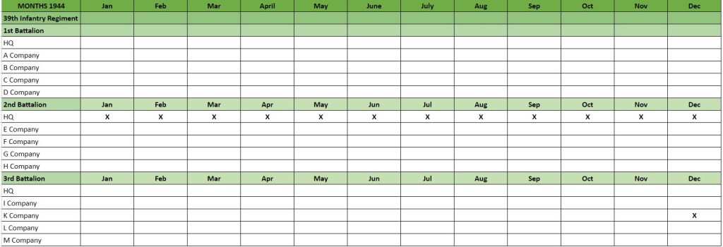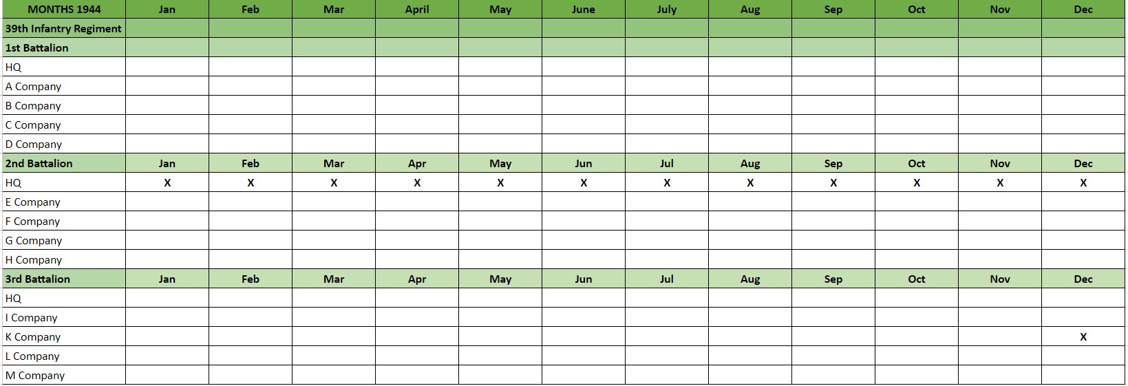 In this overview we present the 3 regiments of the 9th Infantry Division. We want to start collecting the reports for all companies for these 3 Regiments for the months of May to December 1944. More will follow later. I will mark the companies and months we have the reports for with and “X” as soon as I get them in. The project was continued again after NARA opened up, but there is still a delay in my requests.