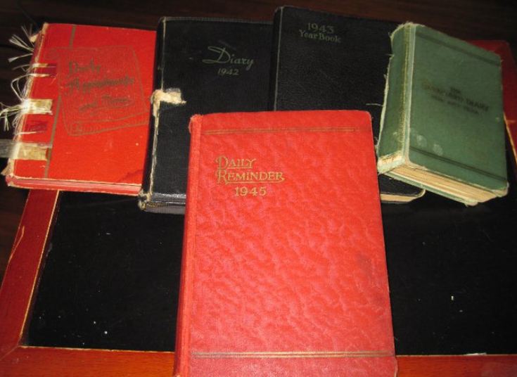 The diaries Frank Lovell kept during his war years. Note the black diary, 2nd on the left. It has a hole in it, made after it was hit by shrapnel in Thala, Tunisia, on 23rd February, 1943