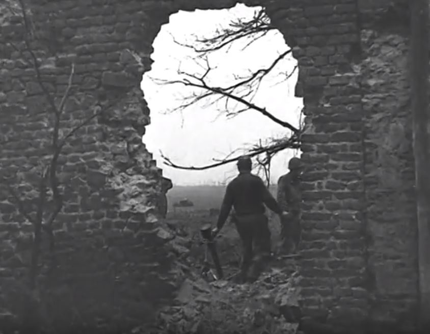 A German mortar is clearly visible right behind the wall.