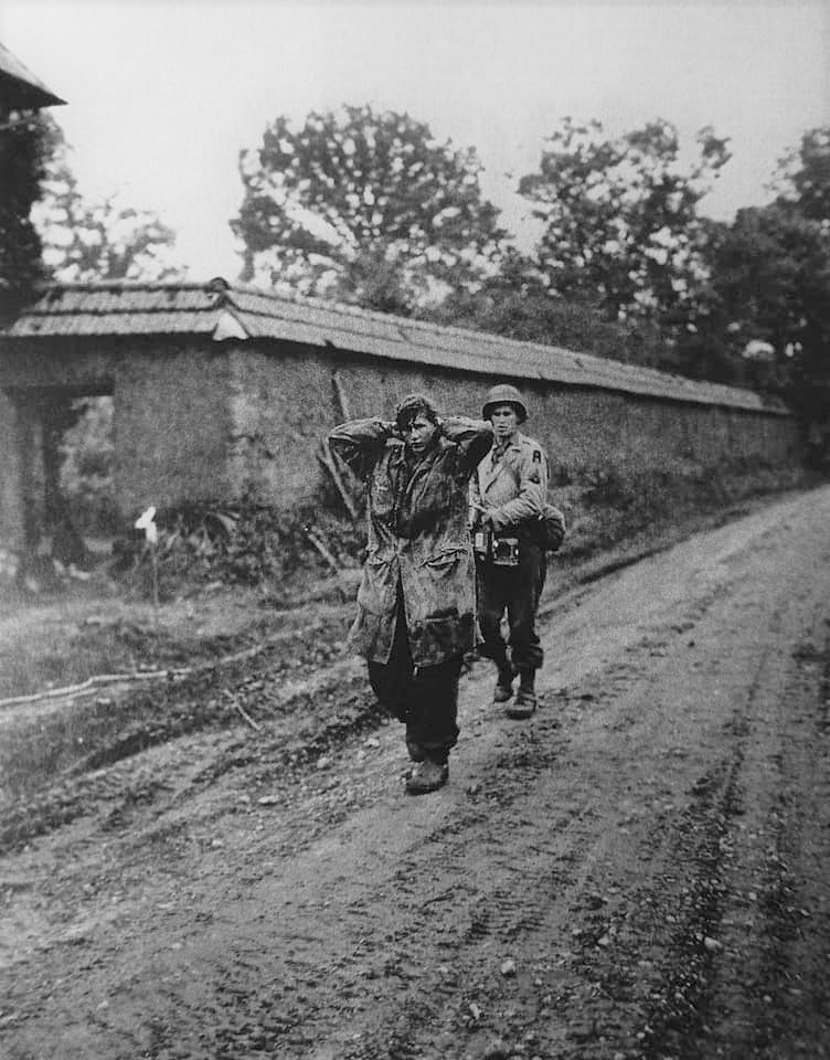 A young German POW is being brought in by Corporal Alex H. Kapitanski at La Courmiette Les Champs de Losque.