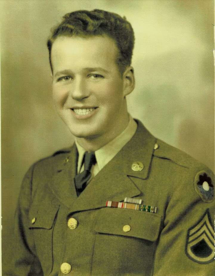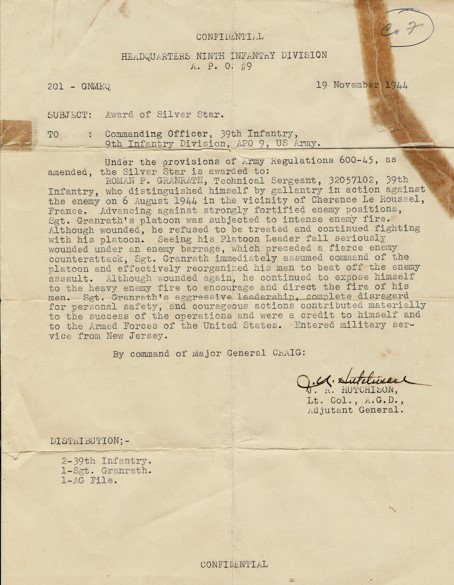 The 39th Infantry Regiment landed at Utah Beach, June 10, 1944. Fighting through France he was wounded twice in the same day near Cherence Le Roussel and received the Silver Star.